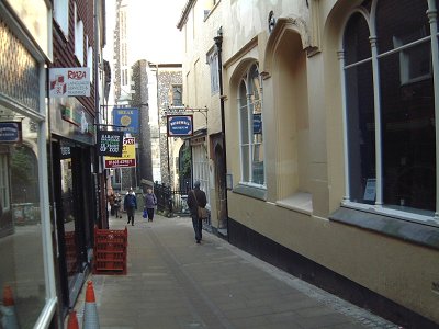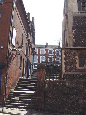 A group of street directories fills in some of the gaps around and between the censuses. Pigot's 1822-3 directory, for example, has a Robert Walker as 'Bookseller, Stationer, Binder and Printer' at St Andrew's, Broad Street. Pigot's 1830 directory lists Robert Walker as printer at St Lawrence's Steps which link St Benedict's and Westwick Street, to the west of the city centre. The christening of both Henrietta and Isabella at St Lawrence in 1827 and 1829 respectively - St Lawrence's church is located on the other side of the steps from the spot that would appear to be where Walker's own premises were situated (see photograph 3, below) - hones in on the period spent at St Lawrence; and details on copy help to fill out the parameters of dating. Before 1827 the christening of Walker's other two children, Mary (1821) and Robert (1825), in St John Madder Market, gives us a likely district in Norwich for domicile south of the Duke's Palace from where many of Walker's first independent pieces were issued (still in the city centre, near to Bridewell Alley where Walker first printed with Robert Lane, as discussed below, and, as it happens, not at all far to the east of St Lawrence).