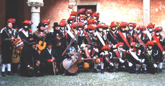 The Masked (i màscher) - On Shrove Tuesday, beside the smart ritual role of the official Compagnia, the unbridled and riotous carnival of 'The Masked', (rich in symbolic meanings, often openly erotic), trails through the streets. Boys and girls, men and women, are disguised in old traditional clothes, often of the opposite sex to the wearer. Their faces are hidden by grotesque masks and their voices are altered. They portray scenes of country life and play unsophisticated jokes - usually involving sexual innuendo and large quantities of confetti or onion skins - mainly on un-masked passers-by. This aspect of the carnevale is much more prevalent in Bagolino, where virtually the entire local population, and a good proportion of the visitors, are màschere.
