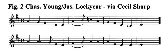 The tune - four-square ABBA, with expected slight variations of note and note-value - is, as was noted above, similar to the other Sharp tune in its movement, with similar melodic arches appearing as shown in the musical example.(Fig. 2, second tune) Bearing in mind the shorthand nature of the lettered ABBA, in the second and third sets of bars as given and, ostensibly, offering a consistent pattern, there is, nonetheless, a distinct climax at the final note of the third set, a flattened, lingering top C.