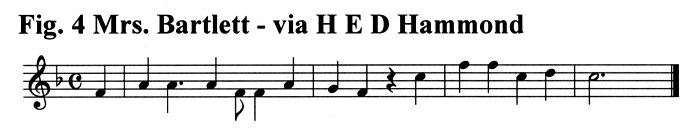 This is described as Dorian in mode on the printed version in JFSS and has resemblance to other English tunes as described above. The second tune, from Mrs Bartlett (Fig. 4), is entirely major and consists of eight bars only.