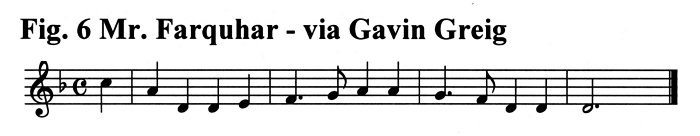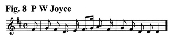 Aside from text (as it were), Joyce's tune, ABCA in form, has echoes of Greig - more properly, vice-versa. Where did Greig's versions come from? The parallels between the first set of bars is clear (Fig. 8) and one should also add that the phrasing in the second set of four bars is particularly noticeable as rising in the manner of Joyce, who may, then, represent a historical descent.