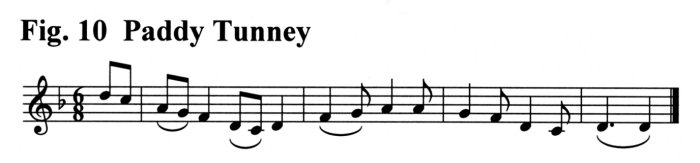 Yet, whilst the time-signature given for the tune is six-eight, the notes and the musical phrasing in the first four and the last four bars do not stand out excessively from English sung versions. The middle two sections, in contrast, do contain an extensive leap upwards. All told this still equates to an ABBA pattern as far as the first given textual stanza goes and it is akin to all the Scottish and Irish versions so far adduced.(Fig. 10)