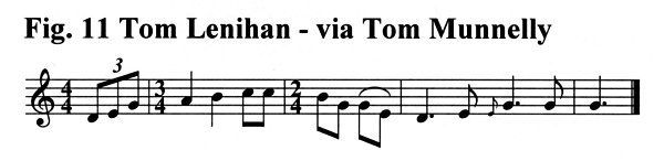 The notation of Tom Lenihan's reproduces varied timing - conventional two-four, three-four and four-four - as the singer varied his phrasing (Fig. 11). This, of course, for the first verse. One would have expected Tom Lenihan to have also varied certain phrases that follow as both sense and the dynamics of the particular occasion dictated. This exposes the limitations of pattern as expressed above in ABBA terms (and others like it) but it does not invalidate a general proposition as far as evidence goes in respect, say, of the relatively close movement of the music in English versions as transcribed by the collectors and the relationship amongst Scottish and Irish tunes - save in this case where there is a unique tune in the whole assembly.