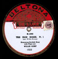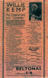 An important session took place in July 1929 when the bothy ballad singer Willie Kemp made his first records. Beltona was the first record company to record this genre and remained so until the post war period. Willie and his cousin George Morris were to remain popular for many years; indeed some of their material was re-issued on LP. Their versions of The Muckin' o' Geordie's Byre, The Barnyards of Delgaty, Drumgeldie and many other songs probably helped to keep the tradition alive and perhaps provided the inspiration for many 'folk' artists.