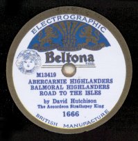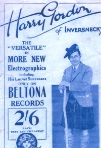 Suddenly records were being issued that would have little or no appeal outside Scotland and even in Scotland would have perhaps been regarded with some suspicion by the more genteel record buyer. The most popular of these new artists was undoubtedly the Aberdeen music hall artist Harry Gordon who was to be the mainstay of the catalogue for many years but he was in the company of such diverse artists as Dufton Scott (dialect monologues), Alec Sim (fiddle), John Henry (melodeon), Rev Dugald McNeil (gospel singer) and Donald Davidson (mouth organ).