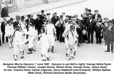 24 The reasons for his apparently brief tenure are unclear, as are those for why he did not assume the role as regular musician upon his move to Bampton in about 1866. Perhaps for the first decade he continued to hire out to other morris dance teams, either out of a sense of loyalty (assuming he had been playing regularly for one or more sets prior to this date), or for more money. At any rate, he is probably the man referred to in the report on the Whit Monday festivities in Bampton in May 1877, when, 'the morris dancers busily tripped the "light fantastic toe" to the sound of fiddle and tambourine.'
