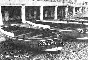 When I used to come home, I always used to go down and see him, down the net arch. Always used to take him a bit of 'bacca and "God Spare me Days" he said, "Look! Why it's young Jack!" he used to say, "how are you getting on, my cock?" 'Cause he knew he was going to get something off me! But he was a nice old feller. His grandson, he married my cousin. My mother's brother. He only had one daughter. Yea. 'Tiddley', we called him, 'Tiddley' Martin. Anyhow they got married and they went to live up Zion Gardens, up by the Clock Tower. My cousin Martha's mother lived there too. They lived in one of them big high buildings, they was six floors up, but she fell over, hanging her washing up and she busted her hip and she died up the County (Royal Sussex County Hospital). And he went to live with his son in Crawley. He's there now and he's eighty-six. I had him down for a fortnight last week. Cor! We didn't half cut a dido, too! Yea. He was a fisherman, too and up Zion Gardens, there was seven cottages, they had a bit of a garden in front. There was a milkman in the first one, but all the others was fishermen.