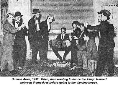This shameful birth, this patronage of tough-guys and of regulars of the night, men as much as women, made the Tango a prohibited dance - and more - a dirty word that no-one should pronounce if he pretends to be decent.One who was horrified by the Tango was Carlos Ibarguren: 'an illegitimate product that has not the natural grace of the country, it is not properly Argentinean but a hybrid phenomenon born in the suburbs and consisting of the mixing of a tropical habanera and a falsified milonga'. Famous band leader Julio do Caro, at the beginning of his career, was ejected from his home when his father, a music professor, discovered that his son was a Tango musician.The high classes were horrified if someone mentioned it, if someone dared talk of this heretical music ... But it is necessary to mention that the problems of the rejection of the Tango were not only those of the high classes; we say that any family which claims to be respectable would close its doors to it, and we include in this those of the middle and working class as well - [Ruben Pesca, The Old Wave]