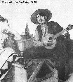 Even a great lover of the Fado, Tinop, in his History of the Fado, written in 1903, said, ironically of the fadista of his time, that he isIn no other city of Europe exists a word with a meaning such as this: the Fadista. To be a fadista signifies to be a tolerated criminal assembled with others of his kind, constituting a class ... The fadista lives by the exploitation of his neighbour. He is usually fed by a prostitute that he exploits systematically. He has no regular address, living successively in a tavern, a brothel or a Police station. He is totally atrophied by idleness, by sleepless nights, by abuse of tobacco and alcohol. He is anaemic, stupid ... and is possessed by a secret disability and various parasites of the skin.