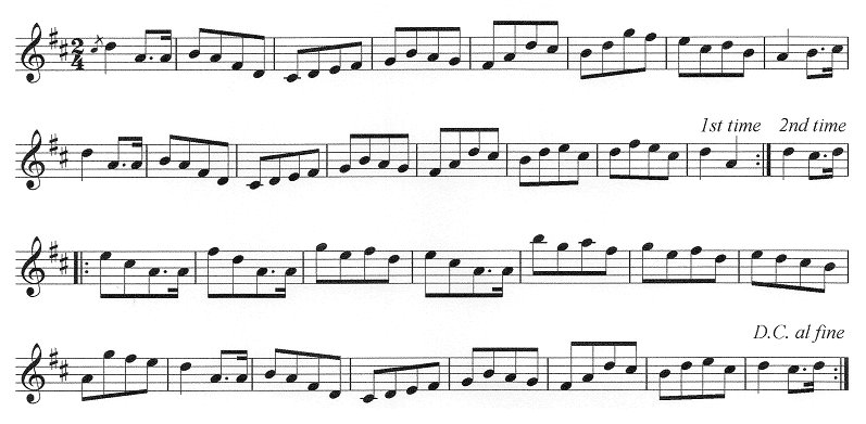 21. The remainder being in 2/4: the settings in the Lister, Moore and Winship manuscript are notated in 4/4, but with a time signature - a C with a line through it - indicating cut-time - 2/2).