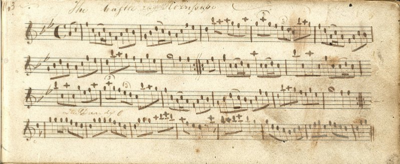 Other settings which resemble Moore's Castle Rag Hornpipe (i.e. no triplets in A1, Cliff-type start to the 2nd strain) can be found in the Nuttall manuscript (Rossendale, Lancashire, c.1830) as the Railway Hornpipe