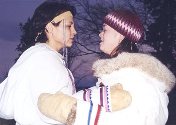 EM: A lot of non-Inuit people have asked the history of throat-singing, and have asked elders to find out where the throat-singing came from. Our elders always say it came from the Inuit people, way before I was born, and that is the only information that they can provide. I've heard this question so many times and I can never answer it, except that it's very old. We've never had a written history; we have an oral history. All this information has never been written down, except passed on orally from one generation to the next. I do know that it is extremely old. Older than my grandmother, older than my great-grandmother, older than my great-great-grandmother. Because that's what my grandparents have told me, and that's what elders have told reporters and television people. I also heard before from the elders, so I will just repeat what the elders have said, that men used to throat-sing, too.