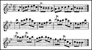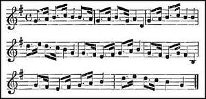 Fanciful as this is, it shows that the dance at that time, was considered an old one. Another origin for the name of the tune is based on a MS. in the writer's possession inscribed 'For the violin, Patrick Cumming his Book: Edinburgh, 1723'. At the end the name is repeated, and the date 1724 given. The tune stands as follows (left), although the Scottish scordatura is likely to puzzle the casual reader, since the first notes which appear as G, A, B, C sound A, B, C, D. (see Scordatura.)