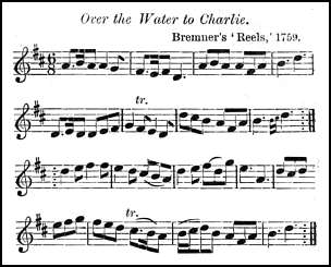 Here it takes a similar form and is repeated in many other dance-books of the period. As Over the water to Charlie, it occurs in the second number of Bremner's Reels and Country Dances, Edinburgh (1759), ob. 4to.