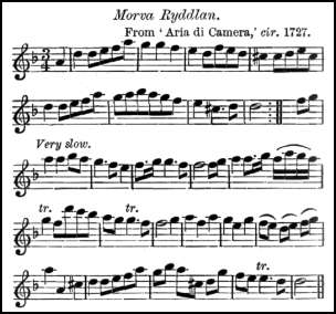 The Bishop of Bangor's jig, Lord of Carnarvon's jig, St. David's Day, and Welch Whim are all in different editions of the Dancing Master, and may, from their titles, be presumed to be of Welsh origin, although not reprinted in any Welsh collection. The fine melody Morva Ryddlan (The Marsh of Rhuddlan) is in Aria di Camera (c. 1727) which also includes the characteristic Meillionen, this latter occurs also in several country dance books about 1735-40.
