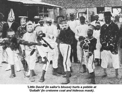 The mummers are divided into two classes - those who act set-pieces, such as David and Goliath and Mongoose plays depicted in the first and second photographs, and those who merely dance and kyact for the entertainment of the onlooker. The third picture represents a mock jumbi, that is to say, an imitation departed spirit; this role being taken by a man in female attire, and having his face concealed by a mask. This person skirmishes around on stilts, and finds himself admirably suited to his part which consists in making himself a general nuisance to all parties.