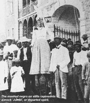 Two centuries of close association with Christianity and civilisation have only served to dilute, not to eradicate, his original belief in Obeah and Fetish; and it is doubtful if the Jumbi dance of today - which is in reality a sort of secondhand spiritualist seance - differs largely from the heathenish rite performed hundreds of years ago by his ancestors in the wilds of Africa.