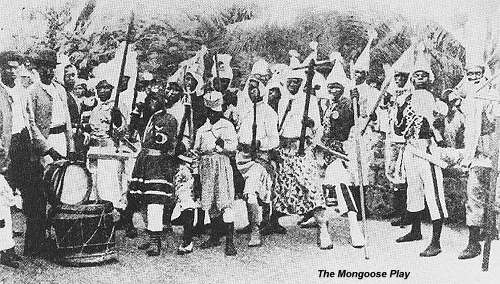 The following text and illustrations are reprinted from Wide World Magazine, VII, 38 (May, 1901). The material is of considerable historical interest because of the detail it provides on a particularly interesting and relatively little-known seasonal custom. The author, Dorothy Harding, had apparently lived in the Caribbean for some years. The editors feel that its value as source material justifies reproduction of what would otherwise be unacceptable in terms of its racist perspective and tone. Thanks to Chris Beaumont for supplying a copy of the original.Additional background material on Mongoose Plays can be found in John Cowley, L'Année Passée: Selected Repertoire in English-Speaking West Indian Music, 1900-1960, Keskidee, III (1993).