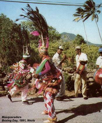We discovered that, with the exception of Black Dan, it was very difficult to get to talk to any of the performers. There is an assumption that if you are white you are an American and therefore a rich tourist, and it was difficult to overcome this. We suspect that even Black Dan did not think that we were seriously interested in the events taking place, although we showed him photographs of English Pace Eggers and North West Morris Dancers. However, we did not encounter any hostility, although our friend who had seen the Masqueraders previously in the north of St Kitts was told in no uncertain terms that he had watched enough. In this country when watching traditional events we like to try and keep to the back of the crowd and not be too obtrusive - this approach does not work so well when you are the only strangers in a small audience.