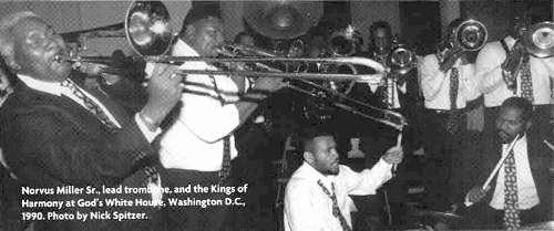 Norvus Miller's energy was amazing - directing a band, playing trombone, always off to another performance. One night after playing late to close a show in Lowell, the Kings rode overnight to do Sunday services in New Haven, Connecticut, then returned to Lowell for a concert that afternoon. Miller spoke fondly of his trips around the country with Daddy Grace and then Daddy McCollough. Norvus's own part-time line of work, driving a long-distance 'Luxury Liner' bus for the House of Prayer, neatly dovetailed with his musical travels with the Kings.