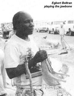 The rest of the band, for that matter, is all rhythm: Egbert Beltran plays the jawbone of an ass and the brake drum of a car, beating it with a metal stick. Ruben Flores beats on the mahogany 'Boom and Chime' drum; one side with a mallet - the boom side - and the other with a drum sack - the chime side. Mr Peters' son, Wilfrid Peters Jr, plays tumbas, which outside Belize are usually called congas. Samuel Myvett pounds away on banjo and relative newcomer to the band, Lennox Blades, plays electric guitar. Lennox replaced Allie Staine who, according to Mr Peters, wasn't holding his rum like he used to. This is soulful, up-tempo, traditional dance music that puts techno and computer driven dance music to shame. When Mr Peters starts to play, it' s simply amazing to watch everyone get up immediately and start dancing.
