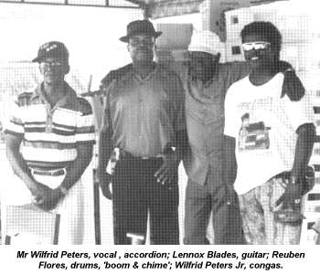 However, Belize City is where Mr Peters and his 'Boom and Chime Band' reside. We recorded and video-taped Mr Peters as best we could . He sings, or rather croaks, in strong Creole accented English and plays a rugged sounding accordion in a rollicking barroom style, somewhere to the left of Louisiana zydeco. Folk Roots described his accordion style as 'heavily influenced by the sound of car horns in a Belmopan traffic jam'. Not to be outdone, his band backs Mr Peters with a most awesome cacophonous rhythm section . As that same reviewer claimed, 'The most driving rhythm playing ever heard, sheer excitement'.