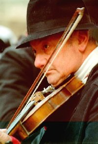 The Apprenticeship - Once, the trainee fiddler learnt his art within the family; having heard the music from birth and - after carefully listening to father, elder brother, uncle - practising on their instruments. There was rarely much of a teacher/pupil relationship, rather a willingness to emulate, to learn, to be successful - and to reap the considerable rewards. Those who didn't belong to a musical family had to hang about the pubs and kitchens where fiddlers used to meet, and then try to keep the tunes in their heads long enough to get to a borrowed fiddle. This must have been very difficult, because all the tunes have two or even three 'voices', and someone playing the music alone was almost unheard of.