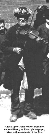 ...Bob Potter, the fiddler of Stanton Harcourt; A. Hathaway with shovel and poker; Tom Dane with money box; John Hathaway, Jnr., as Jack in the Green; Lewis Bensley, the lady with the ladle; Robert Bensley, the Lord of Misrule; H. Bensley, the Fool with the Bladder; and R. Hathaway with money box...This is convincing, if late, evidence of Potter's involvement, but at a much earlier date, in the manuscript of Percy Manning, there is circumstantial evidence to suggest that Potter had indeed been the fiddle player on this occasion. Adjacent to material collected from 'Maxey' Mitchell is the note, 'Taunt's photo taken 1886'.42