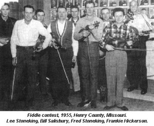 So you might consider that I was simply raised with the fiddle. My dad, Lee Stoneking, was a farmer. I was born at a little old town by the name of Chilhowee up in Johnson County, Missouri. It's about twelve miles north of Clinton as the crow flies. We had forty acres of row crops, but, after all the kids got big enough to actually help, Dad started renting about another one hundred fifty acres more. We all worked hard - my sisters could plough corn just as good as anyone. Cultivating and shucking corn - I just loved that. And we did it all with six head of horses. Boy, I must have walked a million miles behind horses, ploughing ground, by the time I was ten years old. You know, you can learn a lot when you're out in the middle of a forty acre pasture, following along behind a walking plough. You've got the whole world to think in and you can see it all around you. Of course, sometimes you'll start daydreaming. You'll think everything's all right, but then you'll hit a stump out there. When that happens, the horsed jerk you right over the plough, because you've got the lines tied around your belly. That'll wake you up, I guarantee you. There were many times I must have ploughed and been asleep because I didn't remember nothing after.