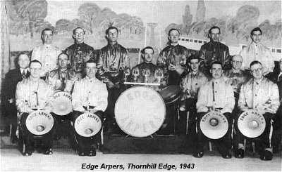 A later development within this tradition were 'The Edge Arpers' consisting of, and whose name derived from the wartime ARP (Air Raid Precautions) workers. Hailing from Thornhill Edge, they were greatly influenced by their musical director F W Peace, a well-known composer, and a large part of their repertoire consisted of 'classical' music. The Arpers were not a carnival band but played at concerts and clubs such pieces as We three working for the ARP, Lost in the Middle of a Moor (composed by Peace), Drink to Me Only with Thine Eyes (with violin imitations) and for a grand finale Land of Hope and Glory.