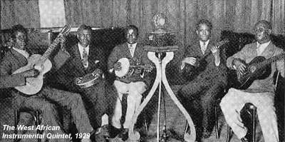 String band music was featured similarly in the Zonophone EZ series, but this was African in origin. In September a recording session by the West African Instrumental Quintet took place in London. The Quintet comprised two guitars, a banjo-mandoline or cavequinho, tambourine and other percussion. Some of the melodies employed by these musicians are very reminiscent of black creole music from the English-speaking West Indies.
