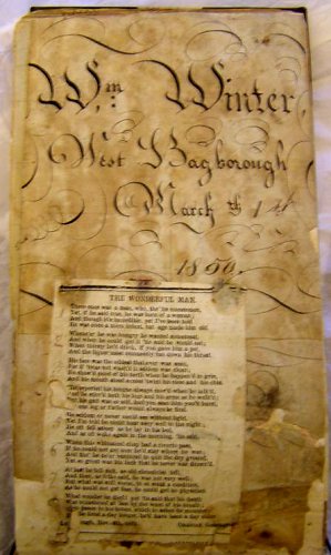 William Winter was born in 1774 in the village of Lydeard St Lawrence in Somerset where he played in the local church band in the first decade of the nineteenth century. He moved to West Bagborough in the Quantocks area in 1822. The manuscript, which is dated 1848 and 1850, is in two distinct parts. After it was found by librarian Geoff Rye in the early 1960s, both sections were bound together and placed in the library at Halsway Manor. The first short section is on narrower darker paper, and suggests that Winter transcribed these tunes at a different time, perhaps earlier in his life. There are two indices in the manuscript itself, and Winter may have transcribed his tunes at least twice during his life, perhaps when the 'originals' became unusable and then writing them out in a more readable fashion later. Some pages, probably from the earlier shorter section, are missing. Winter almost certainly noted the tunes over a period of more than 40 years from around 1810 until the 1850s.