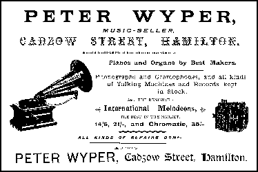 Music-lovers, and melodeon players in particular, will learn with regret of the death of Mr Peter Wyper, music dealer, Hamilton, who was known throughout the country as an accomplished accordion player. Mr Wyper's records on the gramophone are to be found in thousands of homes, and he was a much respected member of the music trade. For a period he was champion melodeon player of Scotland, and his numerous public performances with this instrument were marked by chords and variations which gave great pleasure. Quiet, kindly, and retired, he made many friends in Hamilton and elsewhere. His funeral took place to [sic] Hamilton Cemetary on Wednesday. Mr Wyper, who died at Strathaven, was in his 58th year.28