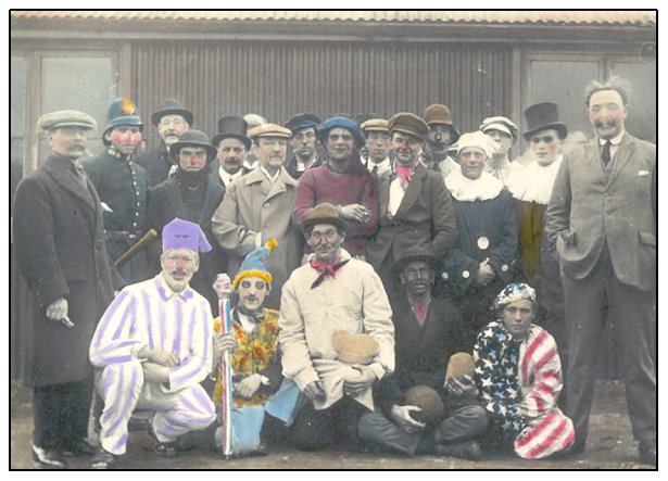 Men in fancy dress; no instruments or collecting boxes. Provenance not known, probably 1920s or 1930s.Hand-tinted private photograph. From Reg Hall Collection.