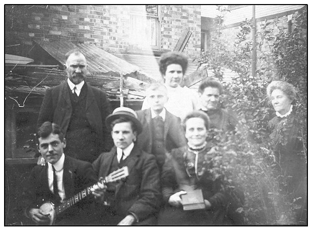A G banjo player in a family group in a back garden.Provenance not known. Could be early 1920s, but probably earlier.From the Reg Hall Collection.