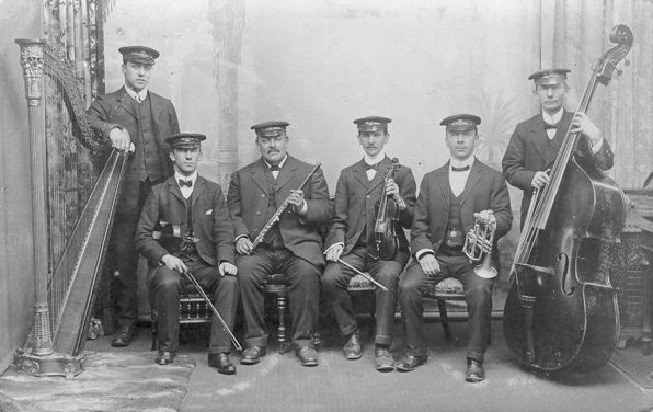 Fiddles, flute and cornet, with bass and harp - Commercial postcard, British, postmarked June 24th, 1908.From the Paul Marsh Collection.