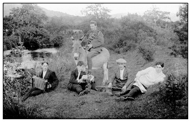 A melodeon player with three young men and a soldier on a donkey!Provenance not known. A private postcard printed on a standard blank postcard printed in English. From the Reg Hall Collection.