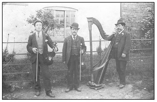 Unidentified trio of harp and two fiddles (no chin-rests?).Provenance not known. Possibly a commercial postcard (commissioned by the trio?), but no publisher's identification, postmarked 1909. From the Reg Hall Collection.