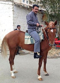 From the first moments of Askarov's performance, an informed listener recognizes the precious style of Kharabakhi singing - a high range, intense, ringing quality. The air reverberates as he leaps to and holds a single note that is never single but enveloped, emerging within endless ornament. His voice also conveys poignant sadness. Askarov tells me that he feels connected with his birthplace when singing mugham and when riding his favorite Karabahi horse (photo, right).