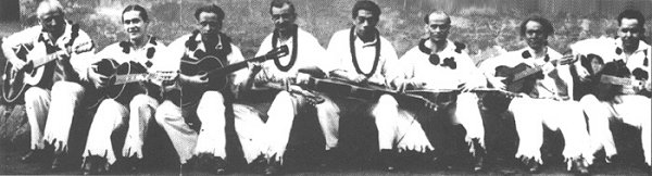 It may well be possible to make music as if the Pacific had been left to the Polynesians. It is surely not possible to attain an historical understanding of modern popular music, without acknowledging the astonishing extent to which it was shaped by Hawaiian music - and (lest we get carried away) by the Iberian influences which formed what we know as Hawaiian music. It seems too obvious to mention (but I'll keep mentioning it, anyway), that the most plausible source of all slide guitar techniques is the influence of Hawaiian steel guitar. It may be, also, that the Hawaiian slack-key tradition is largely responsible for the modern proliferation of guitar tunings. For that matter, perhaps the unprecedented popularity during this century of the guitar itself may be attributed to Hawaiian influence. The ubiquity of the ukulele (originally a Portuguese 'baby guitar') throughout the '20s & '30s can certainly be put down to the Hawaiians. Not only was it the accompanying instrument chosen by many a star of Vaudeville & Variety; in terms of genuine (i.e. participatory) popularity, the uke was to the youth of the jazz & swing eras what the steel-strung guitar was to become to the skiffle, rock 'n' roll, folk & beat generations. Add to these considerations a penchant for falsetto singing and for yodelling (a vocal technique which is also built into the Hawaiian approach to melody and the sound of the steel guitar), and it's hard to see how the importance of Hawaiian music can be denied. A surprising number of people are willing to believe that American music has been profoundly & significantly affected by a single exotic influence. Many of them, however, would rather believe that the influence in question was not turn-of-the-century Hawaii, but seventeenth-century Senegal.