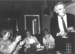 fag in hand, with a clearly engaged audience which, in the second photograph, bursts into approval and laughter. Kennedy is bowing cheekily.