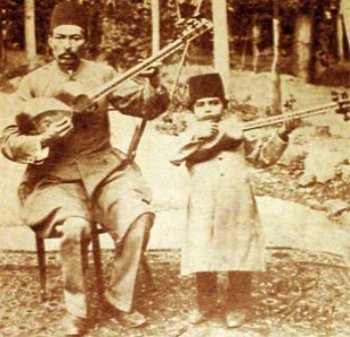 The picture depicts Agha Mirza Hosseingholi and his young son Akbar Khan Shahnazi in 1912. The tar is one of the central instruments of Persian classical music, and variants are also played in Azerbaijan and other Central Asian countries. It is a long-necked lute with three pairs of wire strings, a figure-of-eight shaped body carved out of a single piece of mulberry wood, and a soundboard of thin, tightly stretched lambskin. It has 25 to 28 adjustable gut frets, and is played with a brass plectrum mounted in a small ball or bead of beeswax.