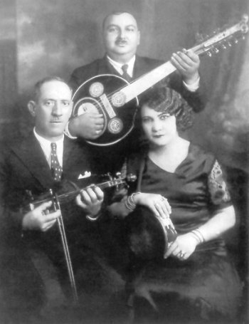 There was in fact a fair amount of luthier experimentation going on in Istanbul in the late 1920s and early 1930s. There were at least two short-lived instruments constructed and played during this period, known as the ahenk, and the neşetkâr or şerâre. The former figures in the oft-used photograph (see below) depicting an Ottoman Greek trio of musicians: the Stromnitsa-born violinist Dimitris Semsis, the Armenian oud player Agapios Tomboulis (Hagop Tomboulian), and the Istanbul-born Jewish singer Roza Eskenazi, who years later converted to Christianity. In the photo in question Tomboulis is depicted holding an instrument which cannot be anything but an ahenk. It seems unclear whether a true neşetkâr has survived.