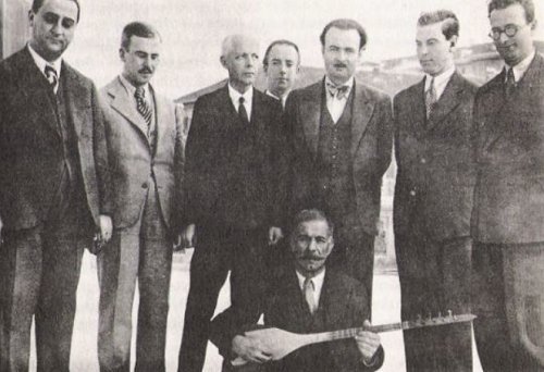 In the photo we see the musician with his instrument and behind, just left of him, Bela Bartok. The saz is a generic word for a family of fretted long-necked lutes with carved wooden bodies and wooden soundboards, of varying size and stringing. All except the smallest, cura saz, have three sets of double or triple strings and are played with a plectrum. The saz has traditionally been a true 'folk' instrument played both by peasants and by the kind of wandering minstrel, often of some specific religious or mystical persuasion, known as asik.